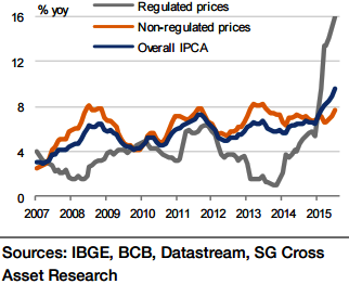 "Full-year inflation is forecasted at 9.0% followed by substantial, yet less than desirable, moderation in 2016 (6.5%) primarily due to the base effect. While theeffect of slow growth and the labour market deterioration could lead to a faster-than-expected slowdown in inflation next year, both the current trajectory and recent history give little confidence in this regard. Inflation will likely remain above the BCB's target over the forecast horizon", says Societe Generale.