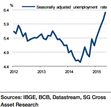 While non-seasonally adjusted data shows Brazil unemployment rate falling to 4.3% in December 2014 and rising to 6.9% through June 2015, seasonally-adjusted series suggests the unemployment rate actually bottomed at 4.5% in June 2014 and has risen to 6.4% since then.