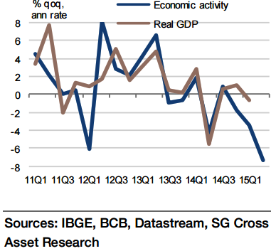 "The economic activity index suggests that Brazil's supply-side economy contracted -7.3% qoq (annualised ) or -3.1% yoy in Q2. This prompts us to project Q2 GDP growth of -1.7% qoq (-7.0% annualised or -2.7% yoy for the non-seasonally adjusted series), which is not significantly different from our earlier forecast", says Societe Generale.