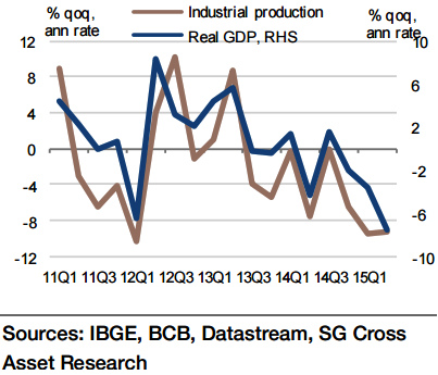 "Brazil's September IP likely falling 9.5% yoy, total production likely declined 9.1% yoy in Q3 and 7.2% yoy YTD. Aniticiparting no changes in the pace of decline in Q4, a total decline of 7.7% is likely to be seen in industrial production for 2015", says Societe Generale.