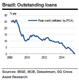 "The country's loans data for August is likely to show further moderation to 9.7% yoy (BRL3,135bn). While business credit growth is estimated to fall to 9.2% yoy, household credit growth likely moderated to 10.25% yoy. Following recent numbers and our forecasts, we estimate real credit growth has turned nearly flat July compared with 5% yoy until end-2014", says Societe Generale in a research note to its client.