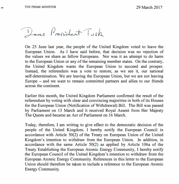 - I hereby notify the European Council in accordance with Article 50(2) of the Treaty on European Union of the United Kingdom's intention to withdraw from the European Union. In addition, in accordance with the same Article 50(2) as applied by Article 106a of the Treaty Establishing the European Atomic Energy Community, I hereby notify the European Council of the United Kingdom's intention to withdraw from the European Atomic Energy Community.