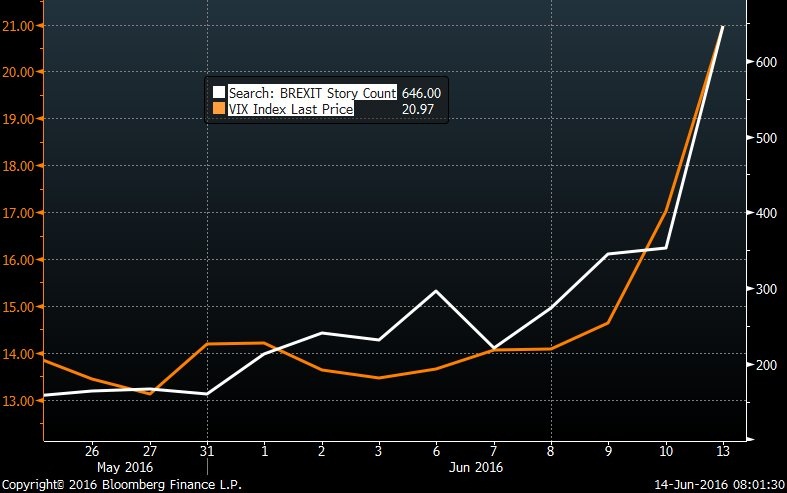 Yet another evidence that the fear surrounding Brexit is fuelling the risk aversion in the market. The chart was shared this week by Aurelija Augulyte, a senior FX strategist at Nordea Markets. It shows the relation of VIX, which measures the volatility in U.S. benchmark stock index, with Brexit story count. They are showing quite an affinity.