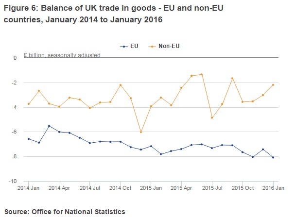 - To argue in favor of UK, its trade deficit in goods with rest of the world in January was -£2.2 billion, just about 25% of the amount with EU.