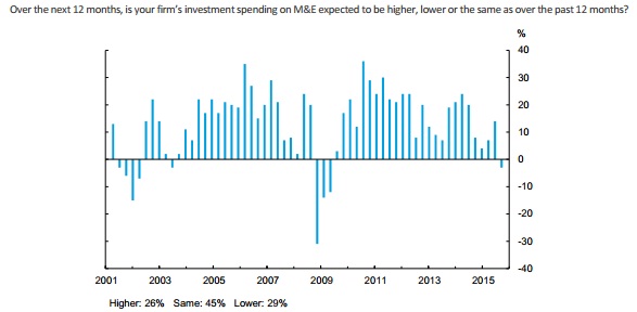 Latest Business condition survey of Bank of Canada show, overall investment intentions in the next 12 months has fallen to negative for first time since the crisis, as shown in figure. As per the survey, 45% of the company said their investments would remain same, while 26% expect it to rise and 29% to decline.