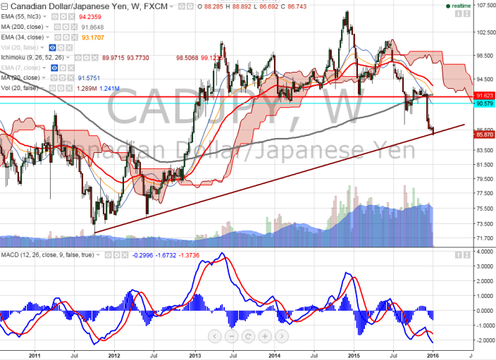 - The pair has broken major trend line support 86 which confirms major weakness, a decline 85.30/82.25 is possible.