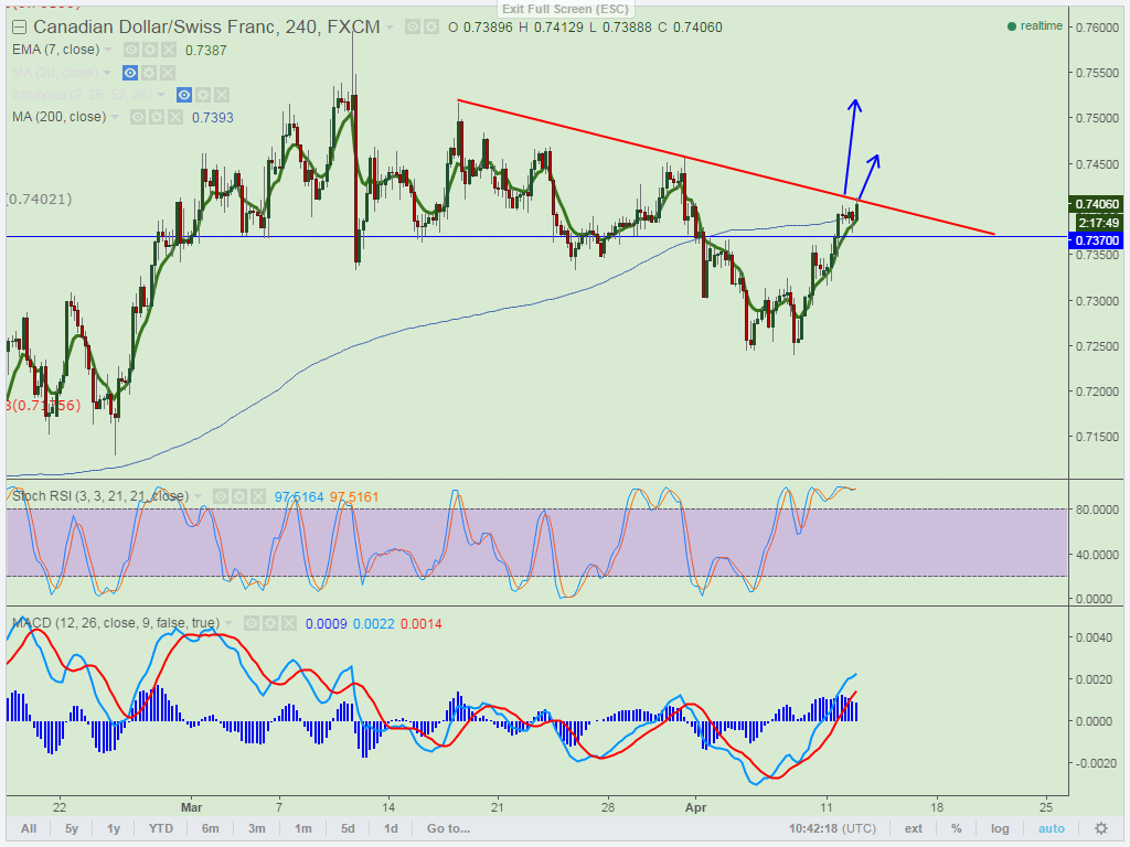 - CAD/CHF is facing strong resistance around 0.7410 and any break above confirms minor trend reversal .The pair has made a high of 0.74093and slightly declined from that level. It is currently trading around 0.7408.