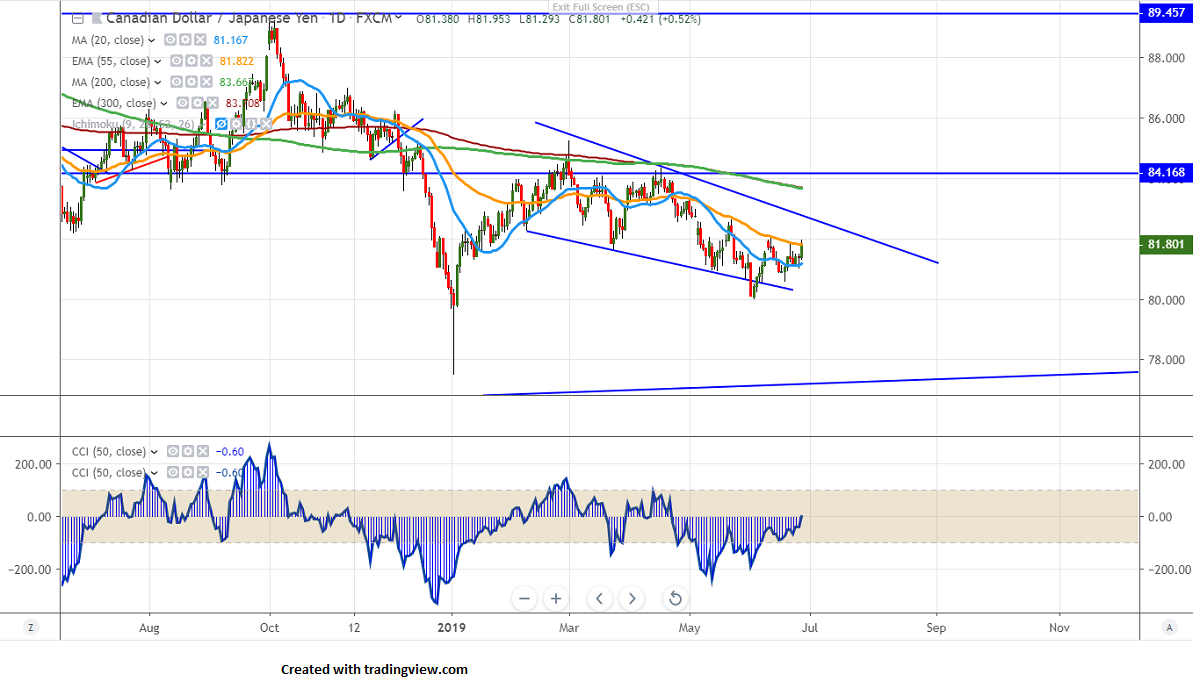 CADJPY is trading higher for the past two days and jumped nearly 100 pips on account of the strong Canadian dollar. The strong oil price due to the escalation of tension between the US and Iran is supporting the pair. The pair has jumped till 55- day EMA for two times (one on Jun 11th and other on Jun 20th). It hits an intraday high of 81.95 and is currently trading around 81.80.