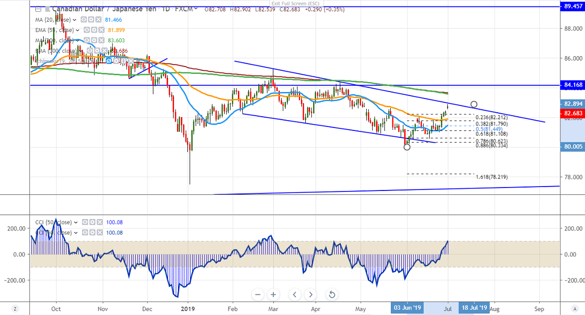 As per our analysis, CADJPY is trading higher and shown a gap up opening today. The jump came after US-China has decided to restart trade talks and the US not going to impose tariffs of $300bn on Chinese imports. The Japanese yen which is considered as a Safe- haven has lost its demand. The strong oil price due to the easing of trade tension. Markets eye OPEC meeting which is to be held from Jul 2nd to 4th Jul for further direction. It hits an intraday high of 82.90 and is currently trading around 82.73.