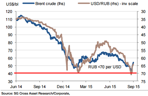 The economy contracted 4.6% yoy in Q2, July CPI edged up to 15.6% from 15.3%. A recent Bloomberg survey shows: 63% of economists expect the CBR will intervene if oil prices fall below $40pbl while 47% see an emergency rate increase, notes SocGen.
