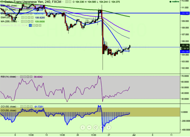 - CHF/JPY’s major resistance is around 105.10 (3 day EMA) and any break above indicates slight bullishness. Any indicative break above 105.10 will take the pair to next level till 106.56 (daily Tenken-Sen)/107.69 (61.8% retracement of 111.40 and 101.73).