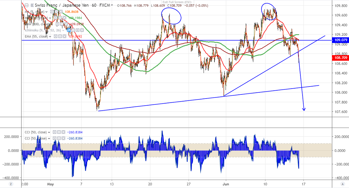 CHFJPY has formed almost a double top around 109.70-75 and shown a 100 pips decline. The decline was mainly due to slight weakness in Swiss franc. SNB has kept its rate unchanged at -0.75% and said that rates will low in the coming months. The bank will intervene in the currency market if Swiss franc gains. USDCHF is trading slightly higher and hits one -week high at 0.99671. CHFJPY hits intraday low of 108.609 and is currently trading around 108.70.