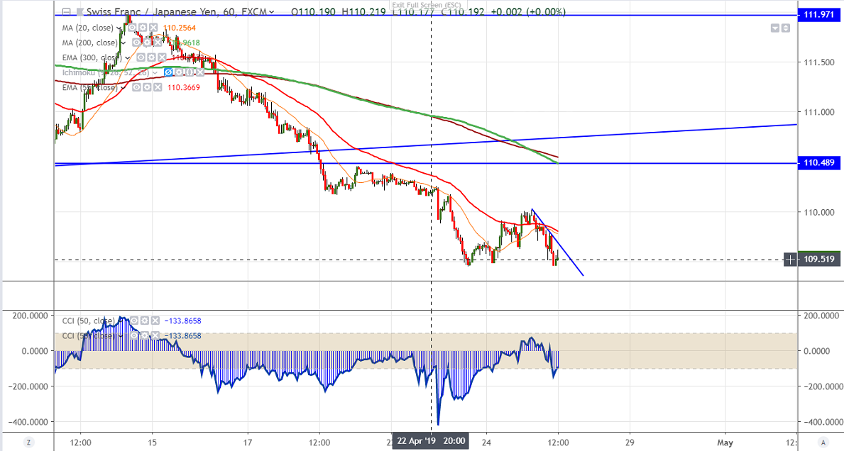 CHFJPY was trading lower for past 2 weeks and lost more than 250 pips. The decline was mainly due to weakness in Swiss franc on account of easing trade tensions which has decreased demand for safe have assets.CHF was trading weak against all majors especially USD and USDCHF gained more than 300 pips in past one month. It is currently trading around 109.57.