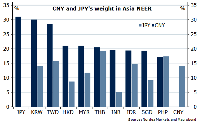 A modest weakening of the CNY is seen this year, but fears of a massive weakening of the CNY have already put pressure on the HKD and more pressure is likely if the CNY starts weakening again. The depreciation in itself is not a concern for the authorities but risks of intensifying capital outflows that could lead to instability in the domestic financial markets. Compared to the JPY, the CNY is more important for most Asian currencies in trade-weighted terms. Indeed, China accounts for around 30% of the trade-weighted JPY, KRW and TWD and for around 20% of the others. In comparison, the JPY accounts for about 20% of the THB, 17% of the PHP and 15% or less of the remaining currencies.