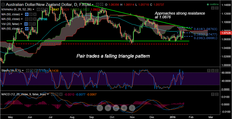 - The pair has been trading a falling triangle pattern, and is approaching resistance by triangle top at 1.0876.