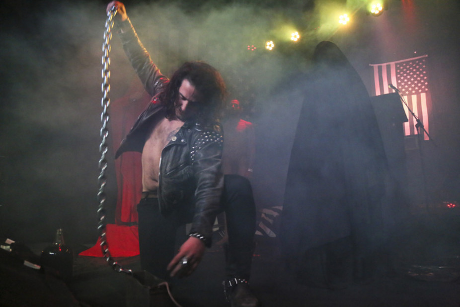 Following the screening, everyone migrated to a bar and music venue called The Sidewinder, where TST held their ritual. Members from the Detroit and San Antonio chapters began setting up and handing out satanic American flags painted in only black and white. I mingled with a small crowd of Satanic sympathizers and the curious. Leather jackets, tattoos and pentagrams were in abundance.