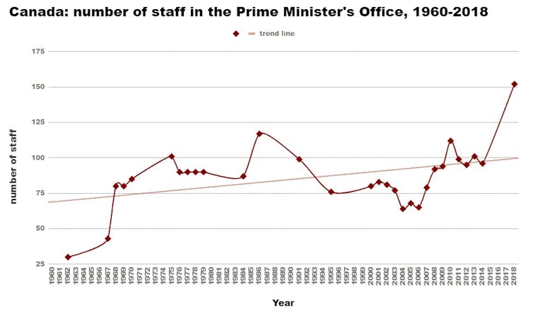 In 2018, Trudeau employed around 152 staff in his office, almost exclusively recruited as partisan appointees. Obtaining accurate numbers of political staff is challenging, however, because Canadian government data is weak.