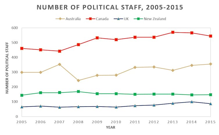 In the United Kingdom, from where Canada modelled its Westminster system of government, the number of equivalent special advisers was 100 (the U.K. has a cap on numbers and are mostly only senior roles). Australia, like Canada, has been enthusiastic with recruiting political staff, and employs about 447 at the federal level.