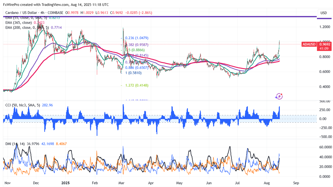 ADAUSD prices surged more than 50% in the past 10 days. It hit a high of $1.0196 at the time of writing and is currently trading around $0.9920. The pair is holding above the short-term (34 and 55-day EMA) and long-term moving average (200-day EMA).