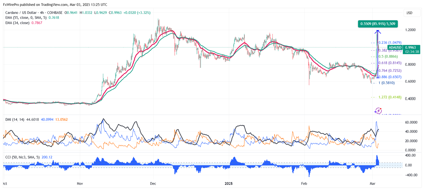 ADAUSD prices surged more than 80% yesterday after positive comments from Trump.in past four days.It hit a high of $1.19 yesterday and is currently trading around $0.9902. The pair is holding above the short-term (34 and 55-day EMA) and long-term moving average (200-day EMA).
