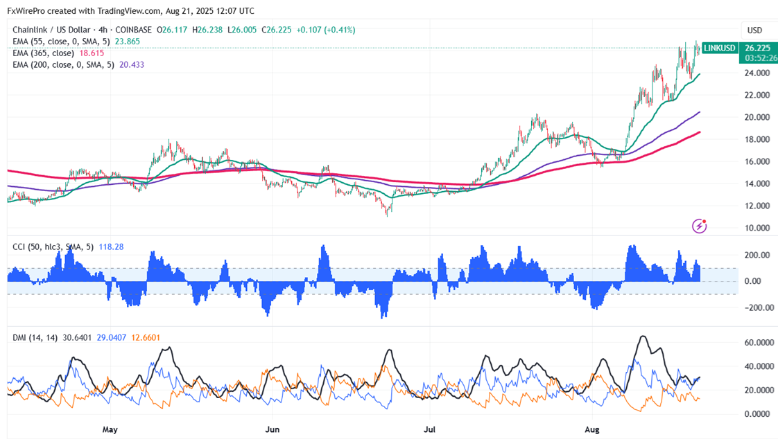 LINKUSD has gained more than 20% in the last two weeks and is holding well above both short-term (21 and 55 EMA) and long-term moving averages. It reached a high of $12.97 on September 28, 2024, and is currently trading around $11.70.