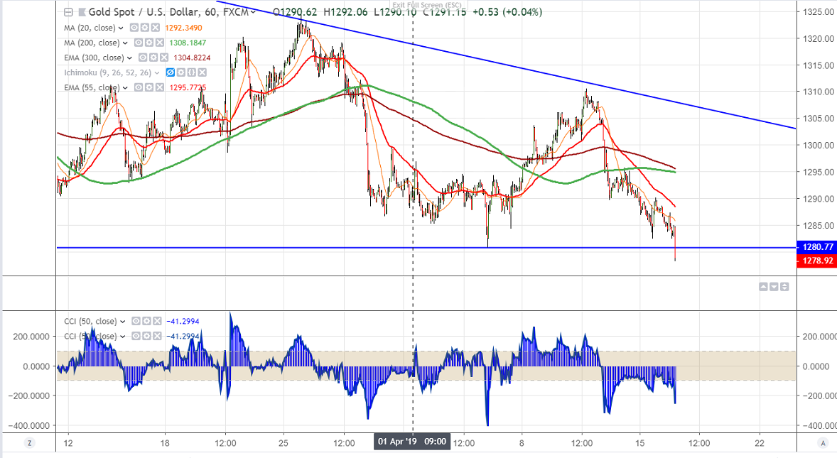 Gold has broken major support $1280 after a long consolidation for 10 trading day. The decline was mainly due to strong global stock market on account of easing US-China trade war. US bond yield slightly reversed from 14-month low of 2.34%. It hits low of $1278.16 and is currently trading around $1279.85.