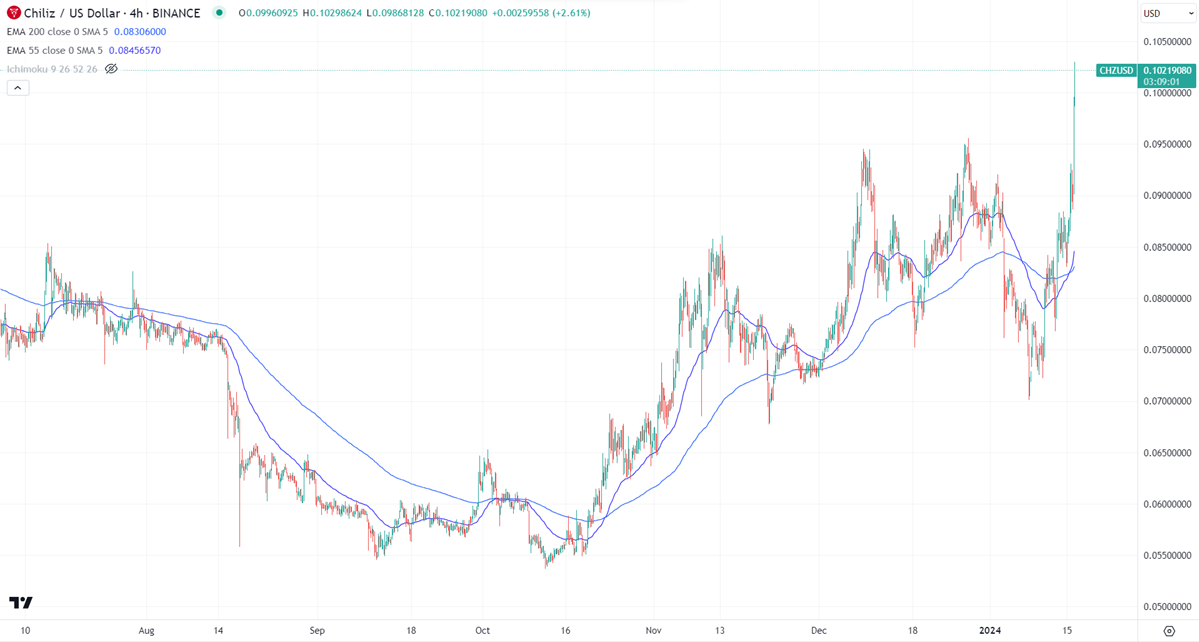 CHZUSD gained more than 45% in this month. The pair holds well above the short-term (21 and 55 EMA) and long-term moving average. It hit a high of $0.1029 and is currently trading around $0.1011.