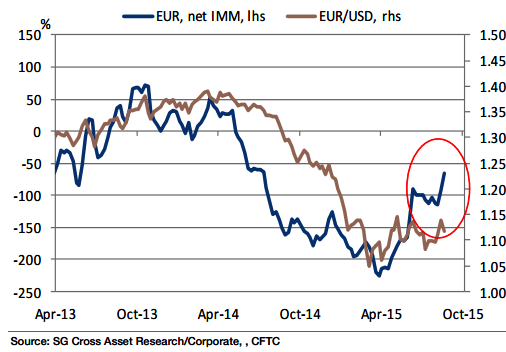 "EUR/USD escaped the narrow trading range last month, scaling a 1.1714 high on 24 August. Short IMM positions have been cut to the lowest level in over a year. The biggest EUR gains have come against the commodity currencies, but a Fed rate hike should trigger EUR/USD profit taking", says Societe Generale.
