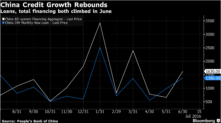 China's H1 2016 monetary data released by the People’s Bank of China (PBoC) showed that New Yuan Loan rebounded to RMB1.38trn from RMB985bn in June, much higher than market expectation (RMB1trn), resulting in a total RMB loan outstanding of RMB101.49trn (14.3% y/y). The data signal policy makers remain determined to keep old growth engines humming even at the cost of adding to debt risk.