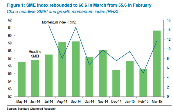 The China's SMEI current performance index rebounded to 58.0 in March from 52.8 in February. Importantly, nearly all performance indicators improved.