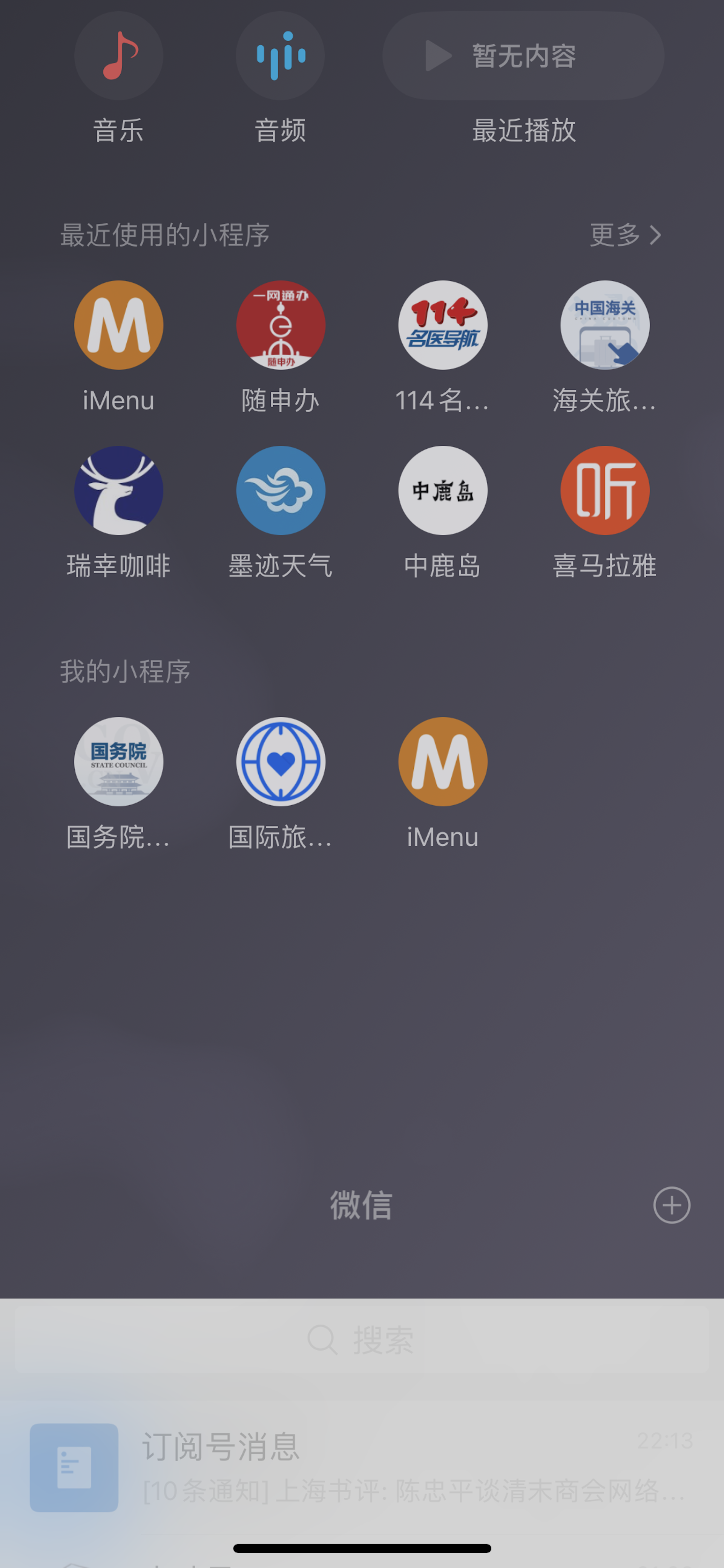 WeChat has a panel of miniprograms that users pull down from the top of the screen. Screen capture by Jianqing Chen, CC BY-ND