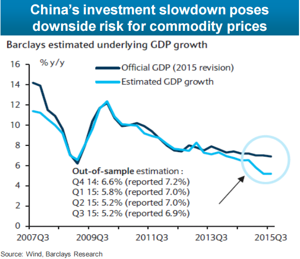 "We forecast 2015 GDP growth at 6.8%. We still see China's transition following a bumpy road, hence, our below-consensus growth forecasts of 6.0% for 2016 and 5.8% for 2017", notes Barclays.