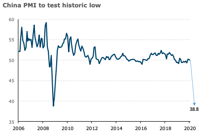 China’s manufacturing PMI for February is expected to hit an historic low of 38.8. The impact of the virus outbreak will see PMI drop further than the previous low in Q4 2008, according to the latest report from ANZ Research.