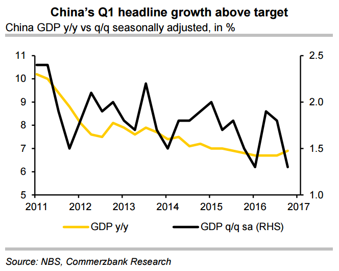 "We think that the investment will unlikely remain elevated for long as property prices have peaked and credit growth is expected to slow down in the second half of this year. We believe that the overall growth trajectory will moderate over the next few quarters; therefore maintain our growth forecast at 6.5% for 2017. Meanwhile, CNY will continue to weaken, and USD-CNY is expected to reach 7.10 by the end of this year," said Commerzbank in a report.