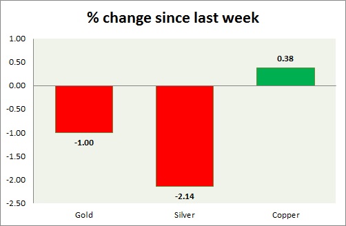 The metal pack is down today. Performance this week at a glance in chart & table -