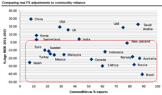 The above chart compares moves in real effective exchange rates since the peak of the commodity cycle in 2011 with the percentage share of commodities in the exports of the various countries. It's not worth putting a best-fit line through this chart, but it does show that a country like Brazil, with its really high reliance on commodity exports, has seen the biggest fall in its currency versus other major EM currencies.