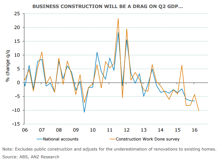 "Falling construction work would probably lop 0.5 percent off second quarter GDP, having already subtracted 0.1 percent from the first quarter," notes ANZ economist Daniel Gradwell in a report.