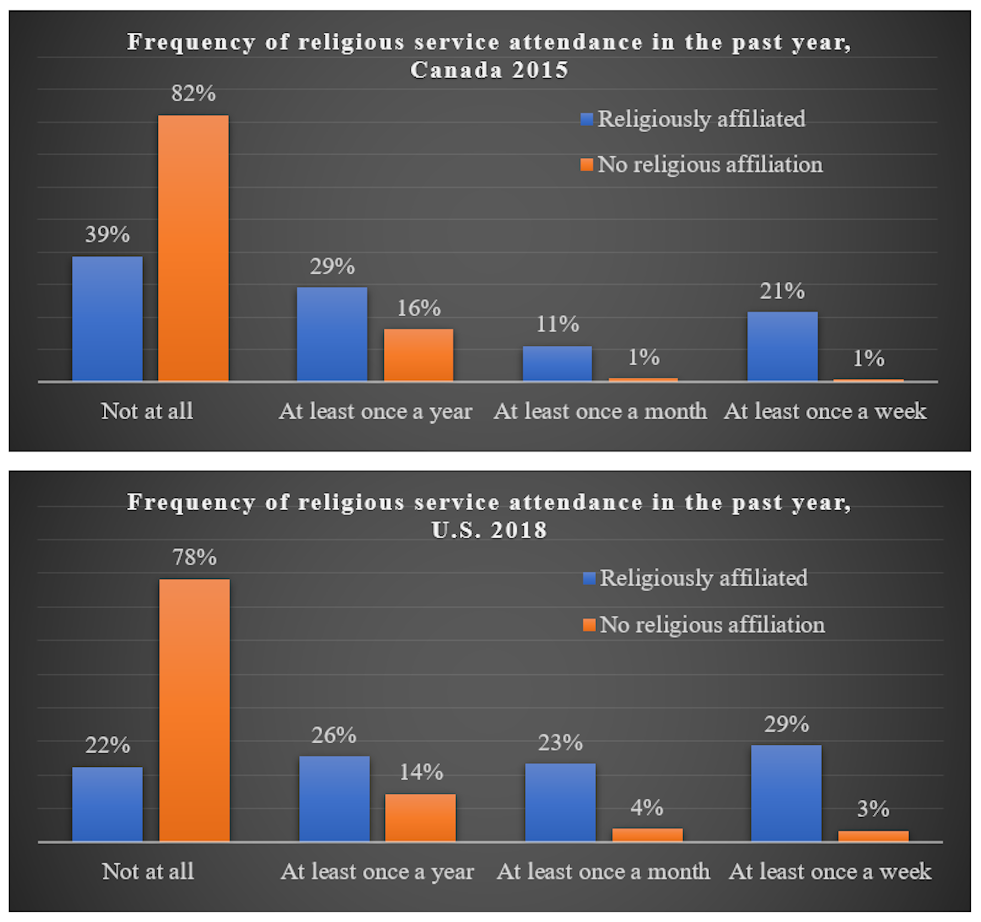 Eighty-two per cent of religious nones in Canada and 78 per cent in the U.S. say they do not take part in such religious activities at all in any given year. Yet, a sizeable minority of nones — 19 per cent in Canada, and 22 per cent in the U.S. — still attend religious services at least once a year, usually during holidays such as Christmas and Easter.