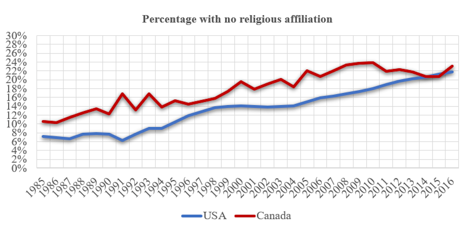 Percentages of those with no religious affiliation in the U.S. and Canada. Data from the 1985-2016 Canadian and American General Social Surveys. (Author provided)