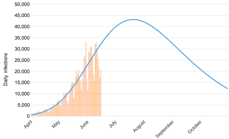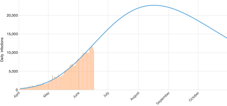 For India, the model suggests a peak in mid-August. This is due to the somewhat constrained spread of the virus thus far, under what was a severe lockdown for the entire country in March. It has since been somewhat eased but remains in marked containment zones in some cities.
