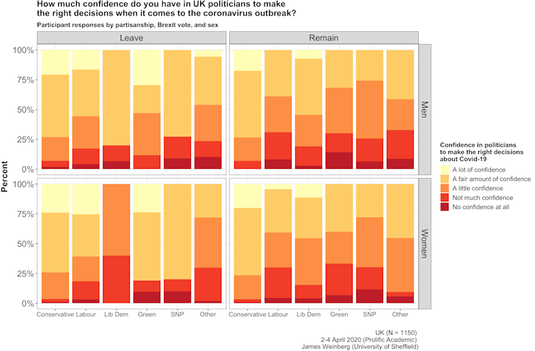When the number of COVID-19 cases rose rapidly in the UK, more stringent protocols were soon introduced. Given the dramatic nature of this U-turn and its life or death consequences, it is unsurprising that the public’s confidence in politicians to manage COVID-19 is mixed. As of early April, only 7% have “a lot of confidence” in the UK’s elected representatives to make the right decisions about COVID-19, while 33% have “not very much confidence” or “no confidence at all”.