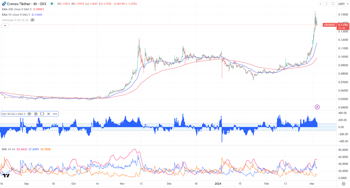 CROUSD surged more than 100 in the past month. It holds above the short-term (21 and 55 EMA) and above the long-term moving average. It hit a high of $0.1545 and is currently trading around $0.13784.