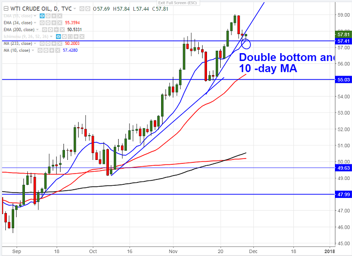 - On the lower side, any break below $57.40 (10- day MA) will drag the commodity down till $56.64 (10- day MA)/$54.89 (Nov 14th 2017 low).
