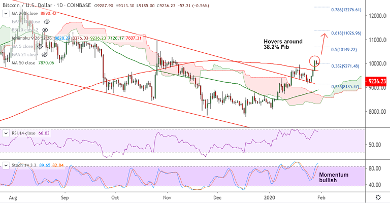 BTC/USD was trading 0.44% lower on the day at 9245 at around 02:50 GMT, bias remains bullish.