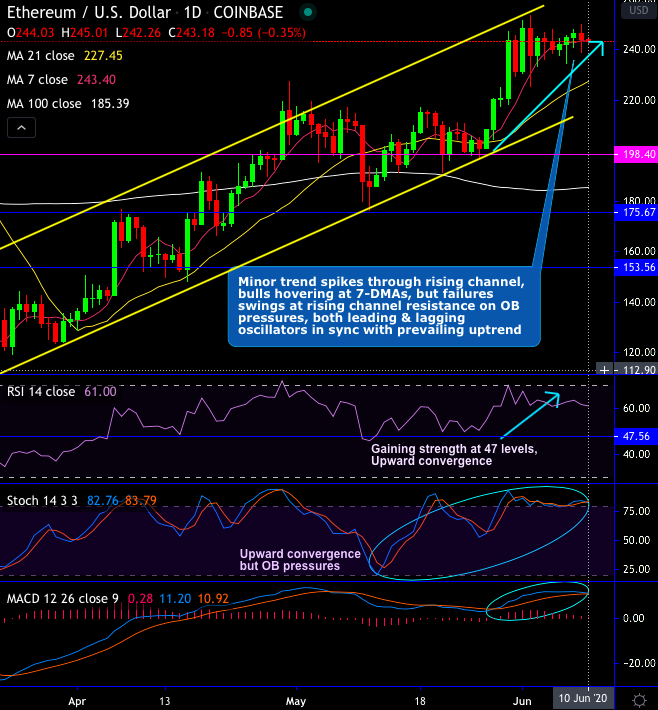 For now, bulls are drifting in sideways upon hanging man occurrence at $244.81 levels but they are not ready to give up as they held firmly at 7DMA levels which is coupled with the healthy buying signals, while both leading & lagging oscillators are in sync with the prevailing uptrend.