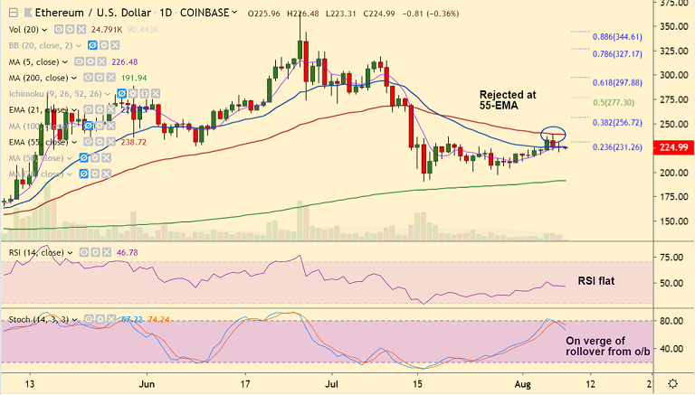 ETH/USD is trading in an extremely narrow range, with session highs at 226.48 and lows at 223.31.