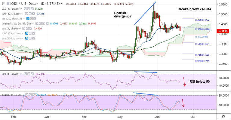 IOT/USD has broken below 21-EMA and is on track to test 50-DMA at 0.3988.