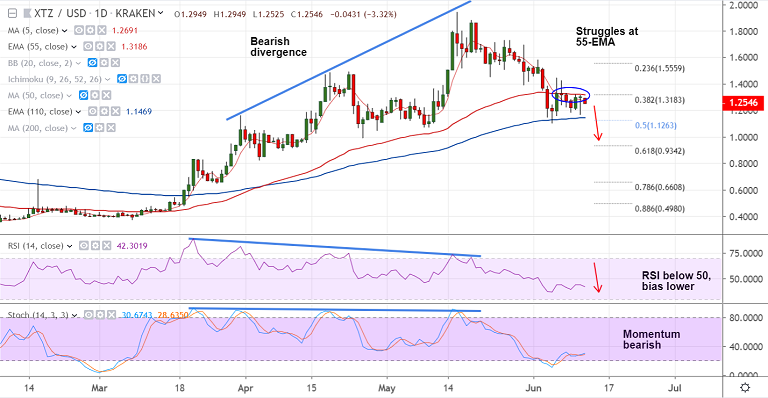 XTZ/USD pauses 3 straight weeks of losses, is extending sideways grind.
