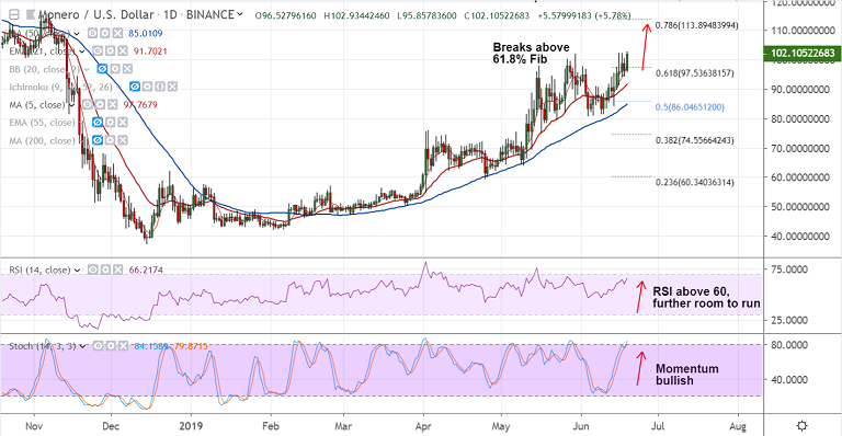 Volatility is rising on the daily charts. Close above $100 mark see gains upto 55W EMA at 107.65. Break above eyes 78.6% Fib at 113.89.