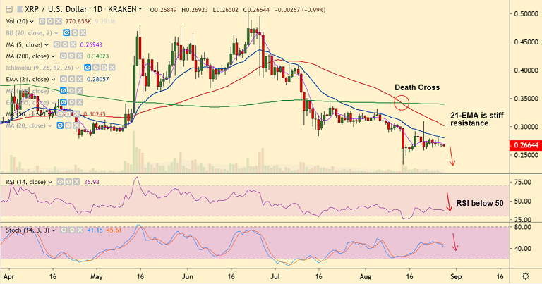 'Death Cross' (bearish 50-DMA crossover on 200-DMA) keeps bearish bias in the pair.